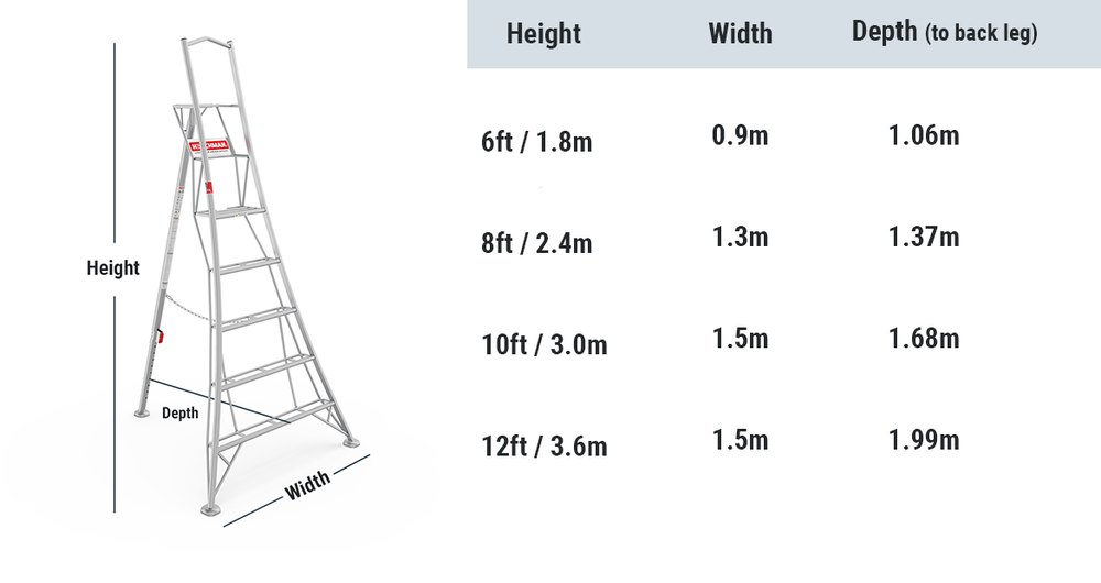 Unser Angebot von Dreibeinleitern mit 3 verstellbaren Beinen beginnt bei 1,8 m, und unsere größte Leiter ist 4,8 m lang. Mit dieser Leiter befinden Sie sich in einer Höhe von 3,9 m über dem Boden.