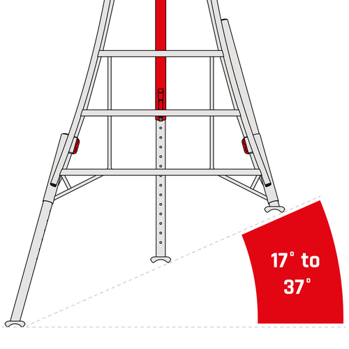 Unser Angebot von Dreibeinleitern mit 3 verstellbaren Beinen beginnt bei 1,8 m, und unsere größte Leiter ist 4,8 m lang. Mit dieser verstellbaren Leiter befinden Sie sich in einer Höhe von 3,9 m über dem Boden.