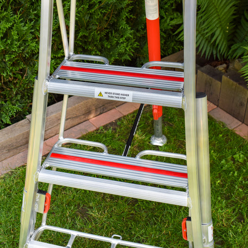 We always recommend that you work between shoulder and waist height. On the Fully Adjustable PRO Tripod, the platform is 3ft/0.9m from the top of the ladder, so your waist is in line with the top.